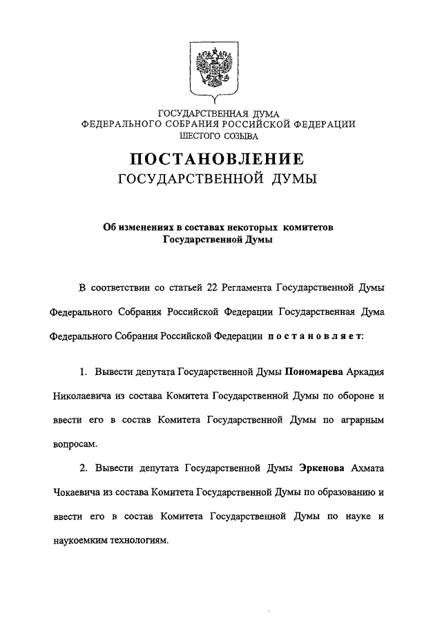 "ОБ ИЗМЕНЕНИЯХ В СОСТАВАХ НЕКОТОРЫХ КОМИТЕТОВ ГОСУДАРСТВЕННОЙ ДУМЫ"