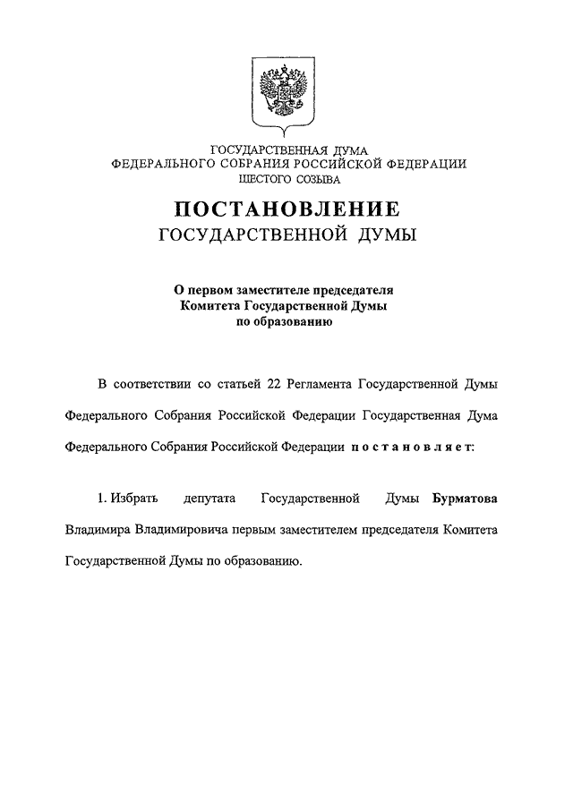 "О ПЕРВОМ ЗАМЕСТИТЕЛЕ ПРЕДСЕДАТЕЛЯ КОМИТЕТА ГОСУДАРСТВЕННОЙ ДУМЫ ПО ОБРАЗОВАНИЮ"