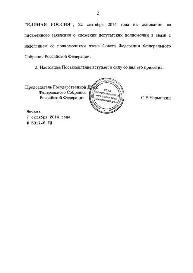 ПОСТАНОВЛЕНИЕ ГД ФС РФ от 07.10.2014 N 5017-6 ГД