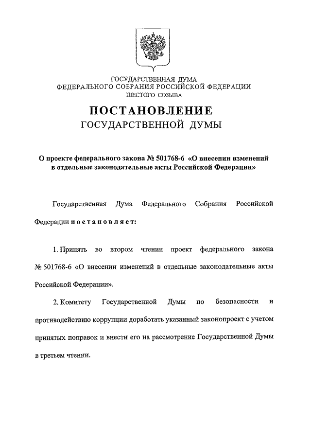 "О ПРОЕКТЕ ФЕДЕРАЛЬНОГО ЗАКОНА N 501768-6 "О ВНЕСЕНИИ ИЗМЕНЕНИЙ В ОТДЕЛЬНЫЕ ЗАКОНОДАТЕЛЬНЫЕ АКТЫ РОССИЙСКОЙ ФЕДЕРАЦИИ"