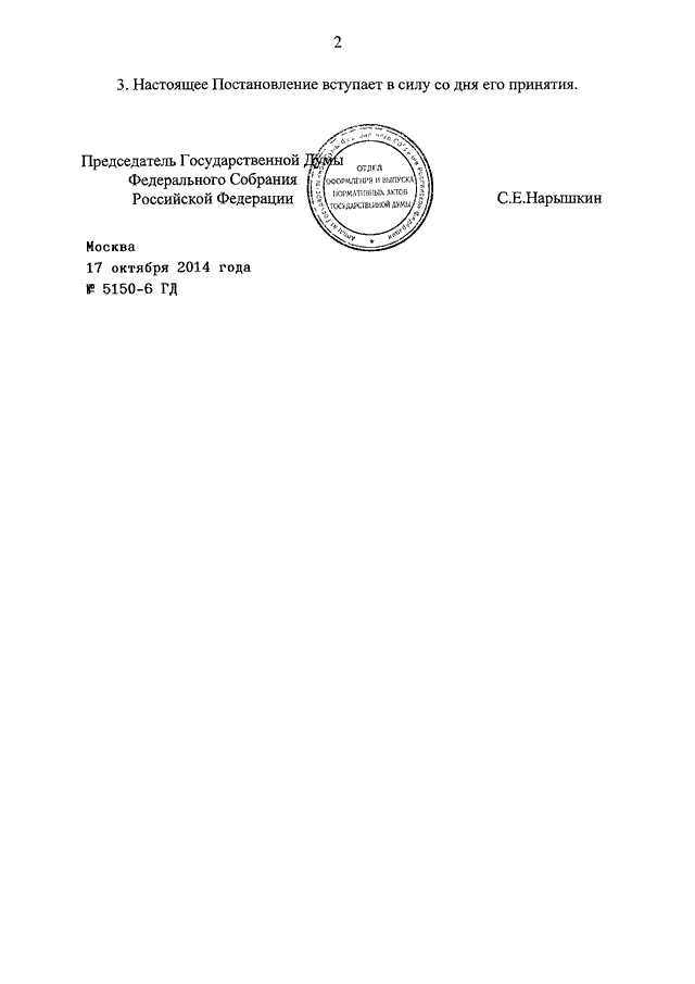 ПОСТАНОВЛЕНИЕ ГД ФС РФ от 17.10.2014 N 5150-6 ГД