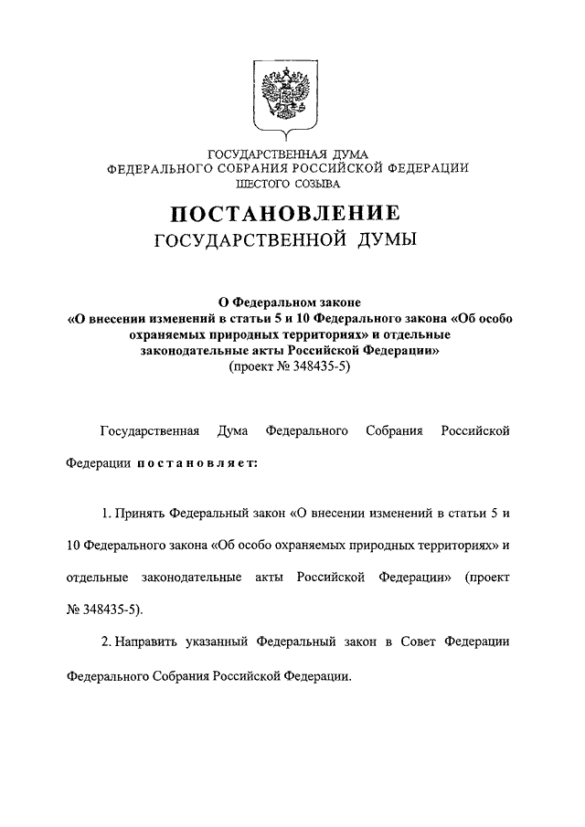"О ФЕДЕРАЛЬНОМ ЗАКОНЕ "О ВНЕСЕНИИ ИЗМЕНЕНИЙ В СТАТЬИ 5 И 10 ФЕДЕРАЛЬНОГО ЗАКОНА "ОБ ОСОБО ОХРАНЯЕМЫХ ПРИРОДНЫХ ТЕРРИТОРИЯХ" И ОТДЕЛЬНЫЕ ЗАКОНОДАТЕЛЬНЫЕ АКТЫ РОССИЙСКОЙ ФЕДЕРАЦИИ" (ПРОЕКТ N 348435-5)"