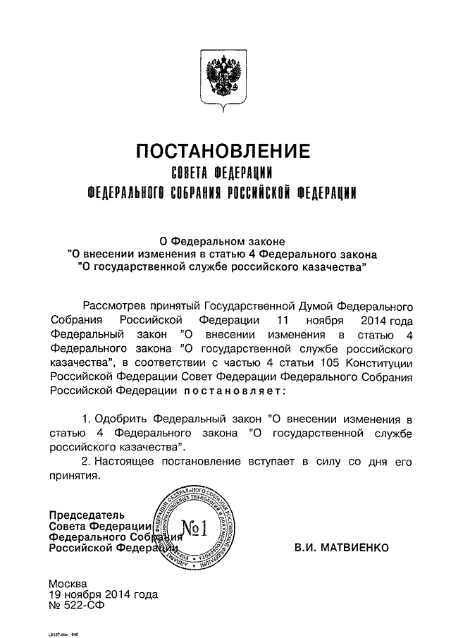 ПОСТАНОВЛЕНИЕ СФ ФС РФ от 19.11.2014 N 522-СФ