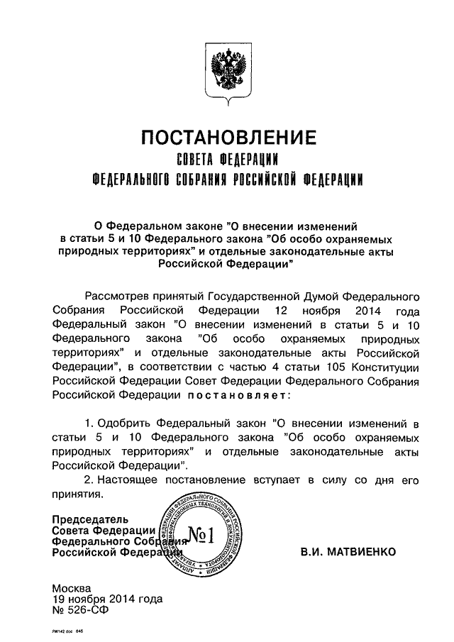 ПОСТАНОВЛЕНИЕ СФ ФС РФ от 19.11.2014 N 526-СФ