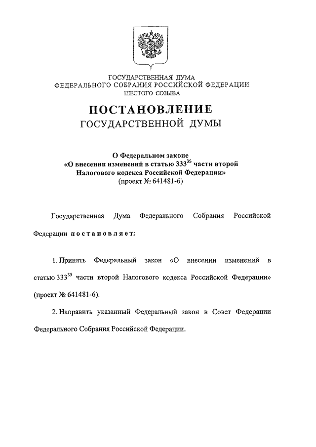 "О ФЕДЕРАЛЬНОМ ЗАКОНЕ "О ВНЕСЕНИИ ИЗМЕНЕНИЙ В СТАТЬЮ 333.35 ЧАСТИ ВТОРОЙ НАЛОГОВОГО КОДЕКСА РОССИЙСКОЙ ФЕДЕРАЦИИ" (ПРОЕКТ N 641481-6)"