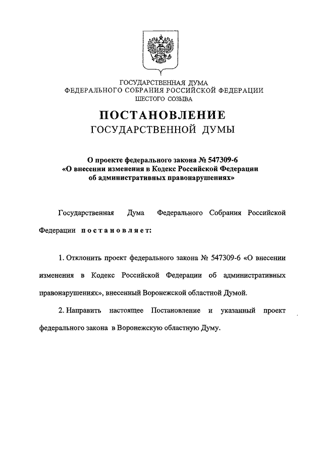 "О ПРОЕКТЕ ФЕДЕРАЛЬНОГО ЗАКОНА N 547309-6 "О ВНЕСЕНИИ ИЗМЕНЕНИЯ В КОДЕКС РОССИЙСКОЙ ФЕДЕРАЦИИ ОБ АДМИНИСТРАТИВНЫХ ПРАВОНАРУШЕНИЯХ"