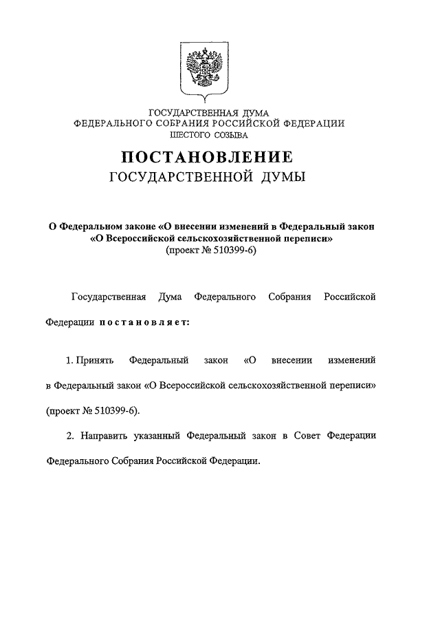 "О ФЕДЕРАЛЬНОМ ЗАКОНЕ "О ВНЕСЕНИИ ИЗМЕНЕНИЙ В ФЕДЕРАЛЬНЫЙ ЗАКОН "О ВСЕРОССИЙСКОЙ СЕЛЬСКОХОЗЯЙСТВЕННОЙ ПЕРЕПИСИ" (ПРОЕКТ N 510399-6)"