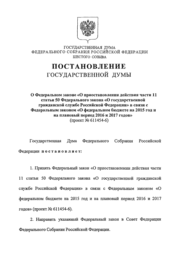 "О ФЕДЕРАЛЬНОМ ЗАКОНЕ "О ПРИОСТАНОВЛЕНИИ ДЕЙСТВИЯ ЧАСТИ 11 СТАТЬИ 50 ФЕДЕРАЛЬНОГО ЗАКОНА "О ГОСУДАРСТВЕННОЙ ГРАЖДАНСКОЙ СЛУЖБЕ РОССИЙСКОЙ ФЕДЕРАЦИИ" В СВЯЗИ С ФЕДЕРАЛЬНЫМ ЗАКОНОМ "О ФЕДЕРАЛЬНОМ БЮДЖЕТЕ НА 2015 ГОД И НА ПЛАНОВЫЙ ПЕРИОД 2016 И 2017 ГОДОВ" (ПРОЕКТ N 611454-6)"