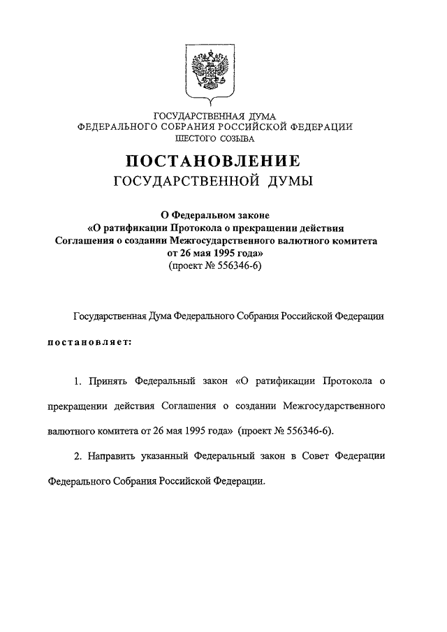 "О ФЕДЕРАЛЬНОМ ЗАКОНЕ "О РАТИФИКАЦИИ ПРОТОКОЛА О ПРЕКРАЩЕНИИ ДЕЙСТВИЯ СОГЛАШЕНИЯ О СОЗДАНИИ МЕЖГОСУДАРСТВЕННОГО ВАЛЮТНОГО КОМИТЕТА ОТ 26 МАЯ 1995 ГОДА" (ПРОЕКТ N 556346-6)"