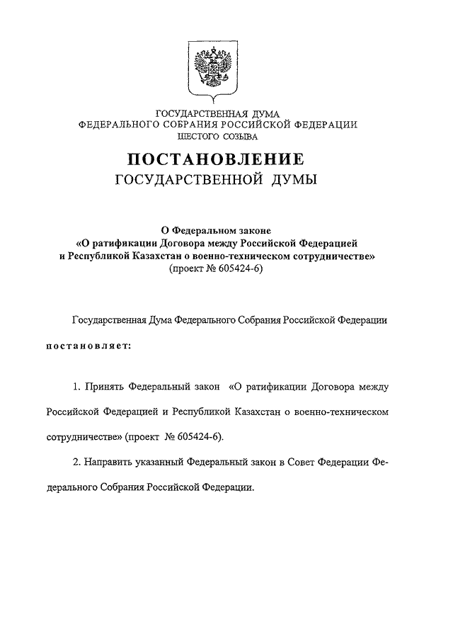 "О ФЕДЕРАЛЬНОМ ЗАКОНЕ "О РАТИФИКАЦИИ ДОГОВОРА МЕЖДУ РОССИЙСКОЙ ФЕДЕРАЦИЕЙ И РЕСПУБЛИКОЙ КАЗАХСТАН О ВОЕННО - ТЕХНИЧЕСКОМ СОТРУДНИЧЕСТВЕ" (ПРОЕКТ N 605424-6)"
