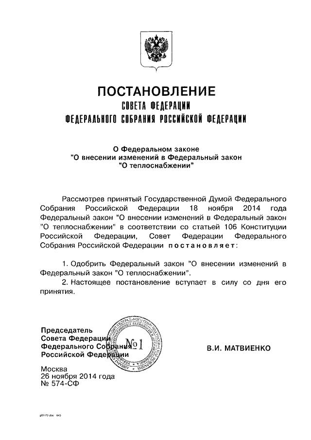 ПОСТАНОВЛЕНИЕ СФ ФС РФ от 26.11.2014 N 574-СФ