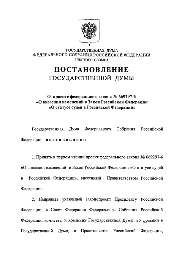 "О ПРОЕКТЕ ФЕДЕРАЛЬНОГО ЗАКОНА N 669297-6 "О ВНЕСЕНИИ ИЗМЕНЕНИЙ В ЗАКОН РОССИЙСКОЙ ФЕДЕРАЦИИ "О СТАТУСЕ СУДЕЙ В РОССИЙСКОЙ ФЕДЕРАЦИИ"