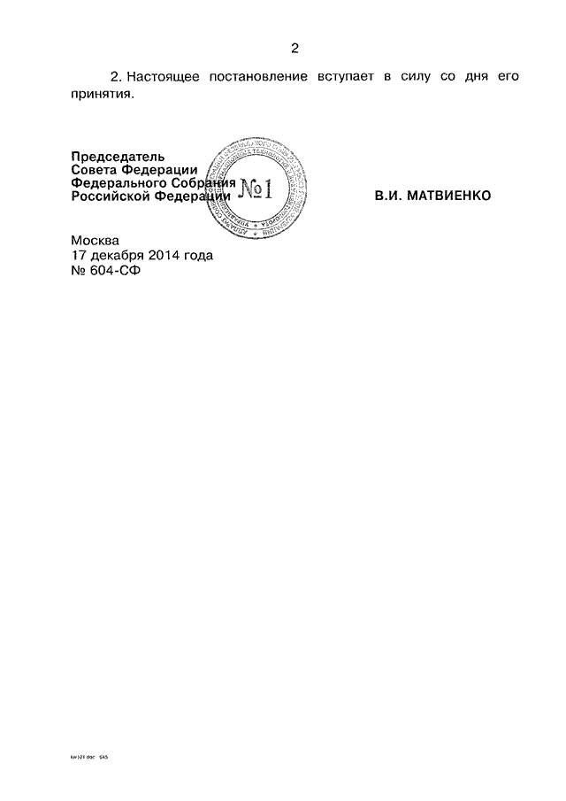 ПОСТАНОВЛЕНИЕ СФ ФС РФ от 17.12.2014 N 604-СФ