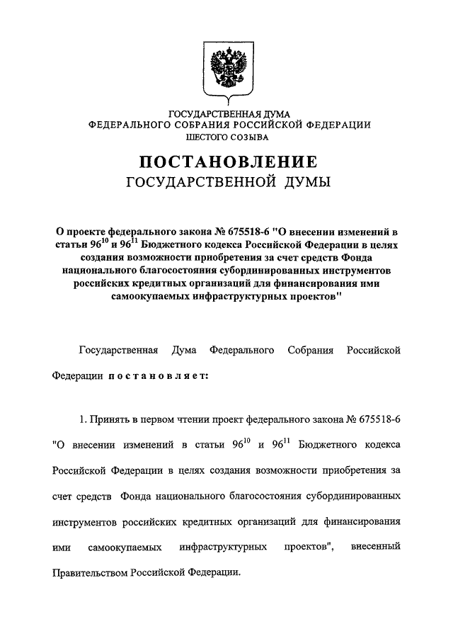 "О ПРОЕКТЕ ФЕДЕРАЛЬНОГО ЗАКОНА N 675518-6 "О ВНЕСЕНИИ ИЗМЕНЕНИЙ В СТАТЬИ 96.10 И 96.11 БЮДЖЕТНОГО КОДЕКСА РОССИЙСКОЙ ФЕДЕРАЦИИ В ЦЕЛЯХ СОЗДАНИЯ ВОЗМОЖНОСТИ ПРИОБРЕТЕНИЯ ЗА СЧЕТ СРЕДСТВ ФОНДА НАЦИОНАЛЬНОГО БЛАГОСОСТОЯНИЯ СУБОРДИНИРОВАННЫХ ИНСТРУМЕНТОВ РОССИЙСКИХ КРЕДИТНЫХ ОРГАНИЗАЦИЙ ДЛЯ ФИНАНСИРОВАНИЯ ИМИ САМООКУПАЕМЫХ ИНФРАСТРУКТУРНЫХ ПРОЕКТОВ"