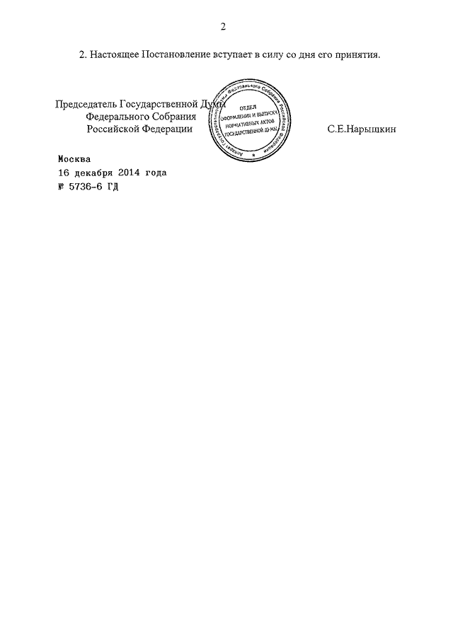 ПОСТАНОВЛЕНИЕ ГД ФС РФ от 16.12.2014 N 5736-6 ГД