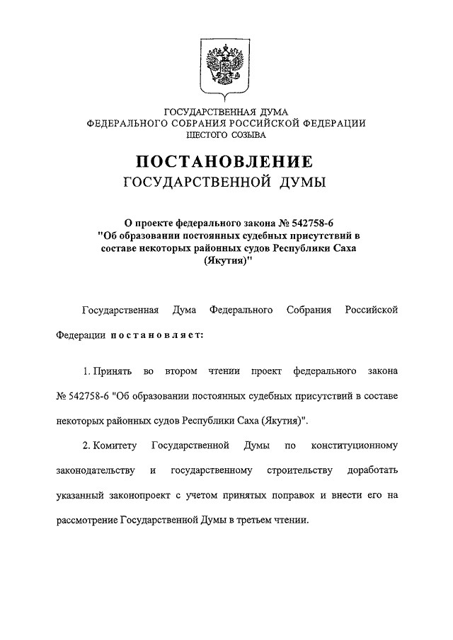 "О ПРОЕКТЕ ФЕДЕРАЛЬНОГО ЗАКОНА N 542758-6 "ОБ ОБРАЗОВАНИИ ПОСТОЯННЫХ СУДЕБНЫХ ПРИСУТСТВИЙ В СОСТАВЕ НЕКОТОРЫХ РАЙОННЫХ СУДОВ РЕСПУБЛИКИ САХА (ЯКУТИЯ)"