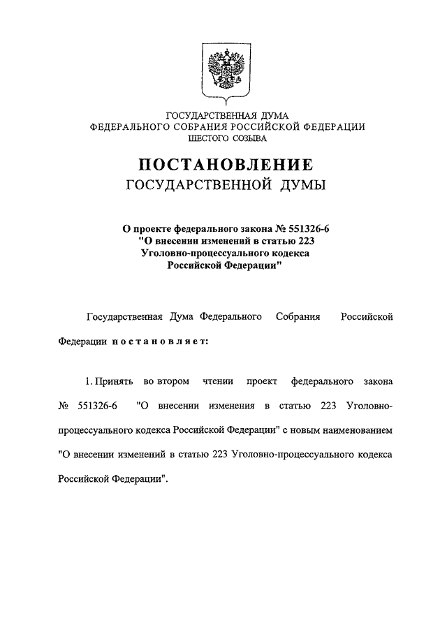 "О ПРОЕКТЕ ФЕДЕРАЛЬНОГО ЗАКОНА N 551326-6 "О ВНЕСЕНИИ ИЗМЕНЕНИЙ В СТАТЬЮ 223 УГОЛОВНО - ПРОЦЕССУАЛЬНОГО КОДЕКСА РОССИЙСКОЙ ФЕДЕРАЦИИ"