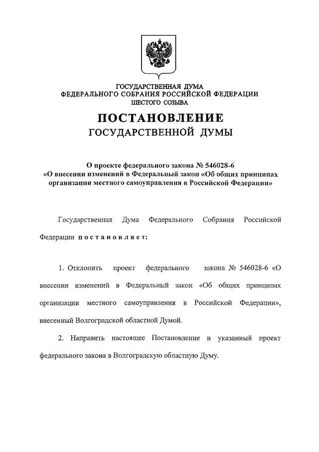 "О ПРОЕКТЕ ФЕДЕРАЛЬНОГО ЗАКОНА N 546028-6 "О ВНЕСЕНИИ ИЗМЕНЕНИЙ В ФЕДЕРАЛЬНЫЙ ЗАКОН "ОБ ОБЩИХ ПРИНЦИПАХ ОРГАНИЗАЦИИ МЕСТНОГО САМОУПРАВЛЕНИЯ В РОССИЙСКОЙ ФЕДЕРАЦИИ"