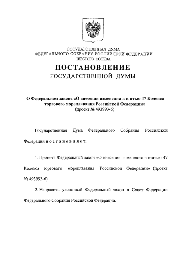 "О ФЕДЕРАЛЬНОМ ЗАКОНЕ "О ВНЕСЕНИИ ИЗМЕНЕНИЯ В СТАТЬЮ 47 КОДЕКСА ТОРГОВОГО МОРЕПЛАВАНИЯ РОССИЙСКОЙ ФЕДЕРАЦИИ" (ПРОЕКТ N 493993-6)"