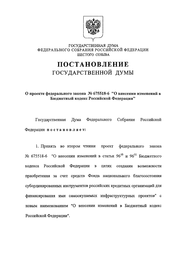"О ПРОЕКТЕ ФЕДЕРАЛЬНОГО ЗАКОНА N 675518-6 "О ВНЕСЕНИИ ИЗМЕНЕНИЙ В БЮДЖЕТНЫЙ КОДЕКС РОССИЙСКОЙ ФЕДЕРАЦИИ"