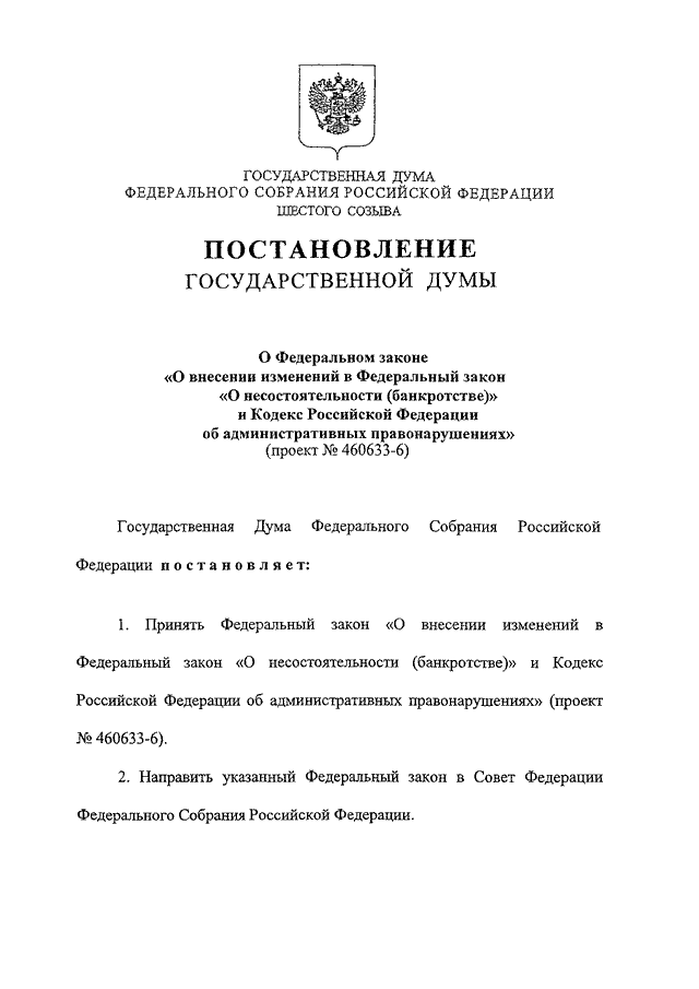 "О ФЕДЕРАЛЬНОМ ЗАКОНЕ "О ВНЕСЕНИИ ИЗМЕНЕНИЙ В ФЕДЕРАЛЬНЫЙ ЗАКОН "О НЕСОСТОЯТЕЛЬНОСТИ (БАНКРОТСТВЕ)" И КОДЕКС РОССИЙСКОЙ ФЕДЕРАЦИИ ОБ АДМИНИСТРАТИВНЫХ ПРАВОНАРУШЕНИЯХ" (ПРОЕКТ N 460633-6)"
