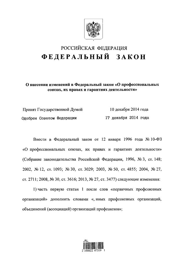 "О ВНЕСЕНИИ ИЗМЕНЕНИЙ В ФЕДЕРАЛЬНЫЙ ЗАКОН "О ПРОФЕССИОНАЛЬНЫХ СОЮЗАХ, ИХ ПРАВАХ И ГАРАНТИЯХ ДЕЯТЕЛЬНОСТИ"