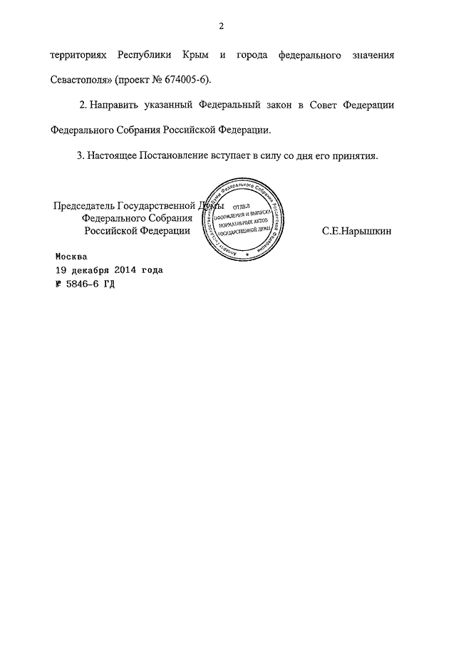 ПОСТАНОВЛЕНИЕ ГД ФС РФ от 19.12.2014 N 5846-6 ГД