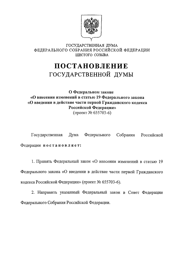 "О ФЕДЕРАЛЬНОМ ЗАКОНЕ "О ВНЕСЕНИИ ИЗМЕНЕНИЙ В СТАТЬЮ 19 ФЕДЕРАЛЬНОГО ЗАКОНА "О ВВЕДЕНИИ В ДЕЙСТВИЕ ЧАСТИ ПЕРВОЙ ГРАЖДАНСКОГО КОДЕКСА РОССИЙСКОЙ ФЕДЕРАЦИИ" (ПРОЕКТ N 655703-6)"