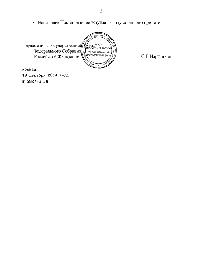 ПОСТАНОВЛЕНИЕ ГД ФС РФ от 19.12.2014 N 5827-6 ГД