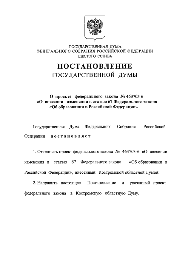 "О ПРОЕКТЕ ФЕДЕРАЛЬНОГО ЗАКОНА N 463703-6 "О ВНЕСЕНИИ ИЗМЕНЕНИЯ В СТАТЬЮ 67 ФЕДЕРАЛЬНОГО ЗАКОНА "ОБ ОБРАЗОВАНИИ В РОССИЙСКОЙ ФЕДЕРАЦИИ"