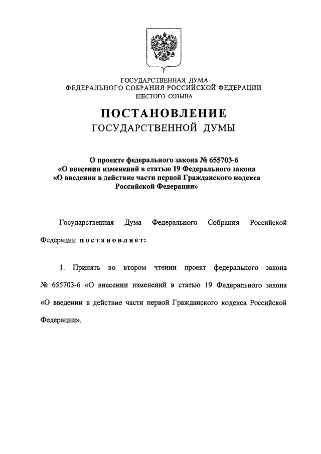 "О ПРОЕКТЕ ФЕДЕРАЛЬНОГО ЗАКОНА N 655703-6 "О ВНЕСЕНИИ ИЗМЕНЕНИЙ В СТАТЬЮ 19 ФЕДЕРАЛЬНОГО ЗАКОНА "О ВВЕДЕНИИ В ДЕЙСТВИЕ ЧАСТИ ПЕРВОЙ ГРАЖДАНСКОГО КОДЕКСА РОССИЙСКОЙ ФЕДЕРАЦИИ"