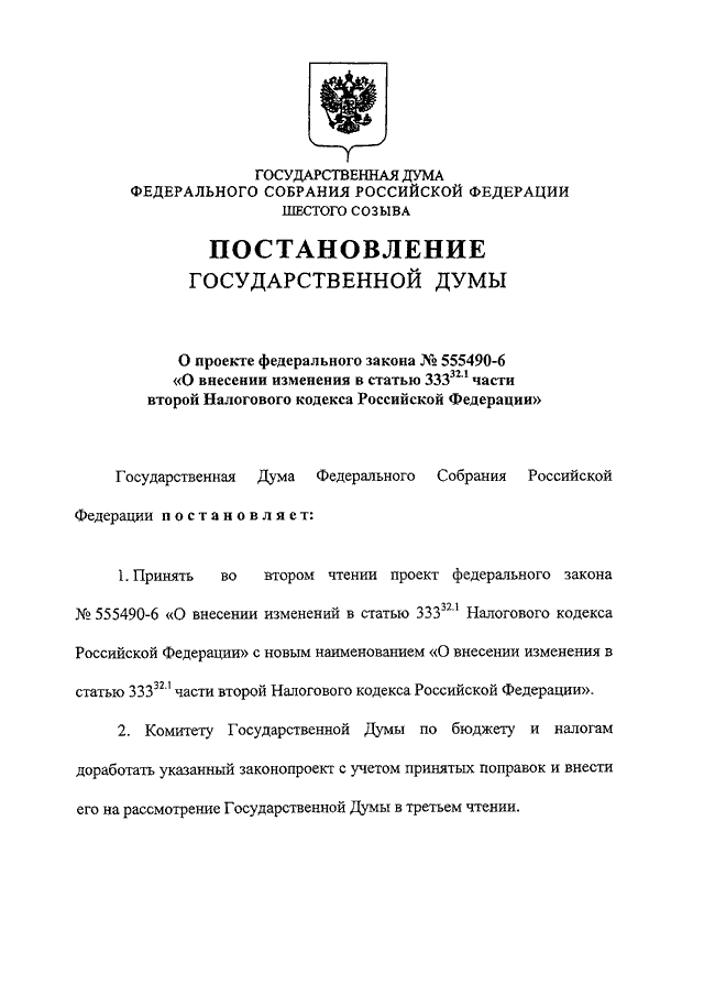 "О ПРОЕКТЕ ФЕДЕРАЛЬНОГО ЗАКОНА N 555490-6 "О ВНЕСЕНИИ ИЗМЕНЕНИЯ В СТАТЬЮ 333.32.1 ЧАСТИ ВТОРОЙ НАЛОГОВОГО КОДЕКСА РОССИЙСКОЙ ФЕДЕРАЦИИ"