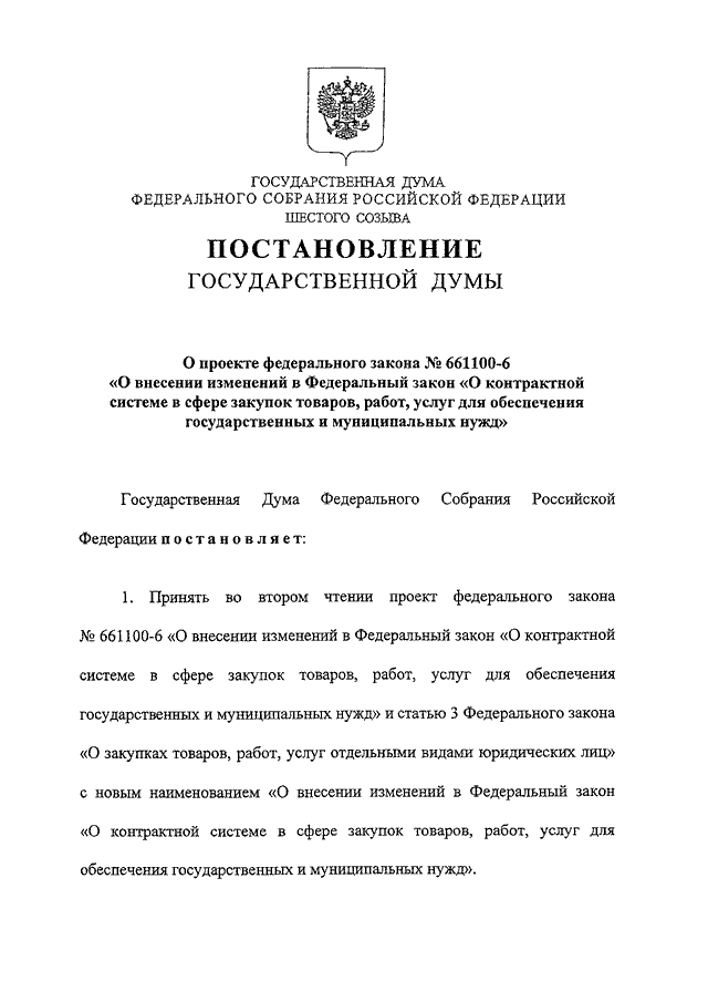 "О ПРОЕКТЕ ФЕДЕРАЛЬНОГО ЗАКОНА N 661100-6 "О ВНЕСЕНИИ ИЗМЕНЕНИЙ В ФЕДЕРАЛЬНЫЙ ЗАКОН "О КОНТРАКТНОЙ СИСТЕМЕ В СФЕРЕ ЗАКУПОК ТОВАРОВ, РАБОТ, УСЛУГ ДЛЯ ОБЕСПЕЧЕНИЯ ГОСУДАРСТВЕННЫХ И МУНИЦИПАЛЬНЫХ НУЖД"
