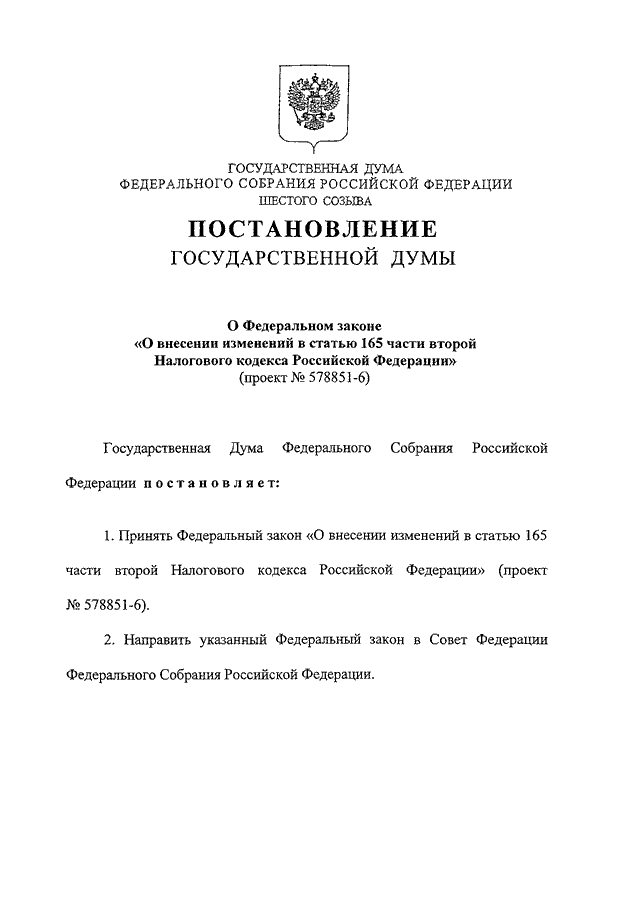 "О ФЕДЕРАЛЬНОМ ЗАКОНЕ "О ВНЕСЕНИИ ИЗМЕНЕНИЙ В СТАТЬЮ 165 ЧАСТИ ВТОРОЙ НАЛОГОВОГО КОДЕКСА РОССИЙСКОЙ ФЕДЕРАЦИИ" (ПРОЕКТ N 578851-6)"