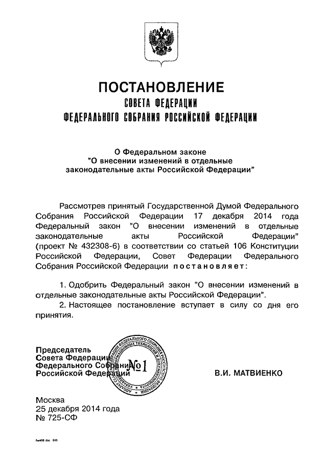ПОСТАНОВЛЕНИЕ СФ ФС РФ от 25.12.2014 N 725-СФ