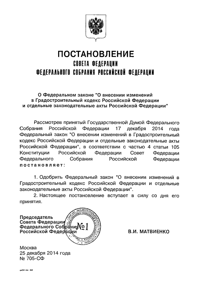 ПОСТАНОВЛЕНИЕ СФ ФС РФ от 25.12.2014 N 705-СФ