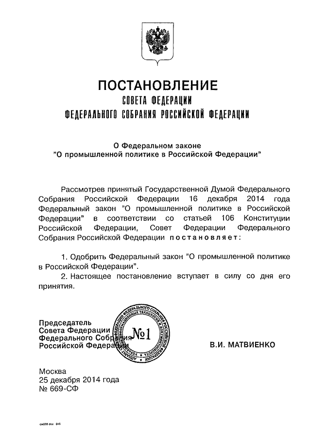 ПОСТАНОВЛЕНИЕ СФ ФС РФ от 25.12.2014 N 669-СФ