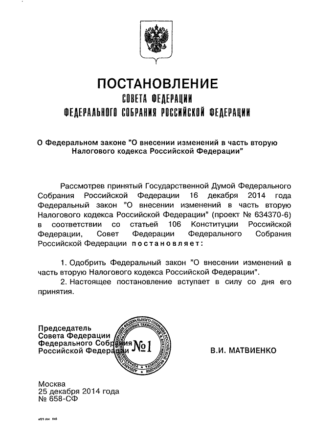 ПОСТАНОВЛЕНИЕ СФ ФС РФ от 25.12.2014 N 658-СФ