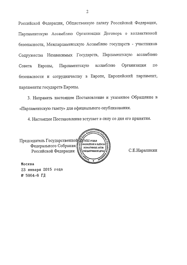 ПОСТАНОВЛЕНИЕ ГД ФС РФ от 23.01.2015 N 5964-6 ГД