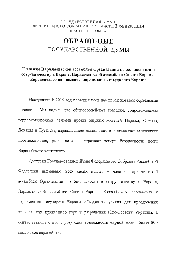 "ОБ ОБРАЩЕНИИ ГОСУДАРСТВЕННОЙ ДУМЫ ФЕДЕРАЛЬНОГО СОБРАНИЯ РОССИЙСКОЙ ФЕДЕРАЦИИ "К ЧЛЕНАМ ПАРЛАМЕНТСКОЙ АССАМБЛЕИ ОРГАНИЗАЦИИ ПО БЕЗОПАСНОСТИ И СОТРУДНИЧЕСТВУ В ЕВРОПЕ, ПАРЛАМЕНТСКОЙ АССАМБЛЕИ СОВЕТА ЕВРОПЫ, ЕВРОПЕЙСКОГО ПАРЛАМЕНТА, ПАРЛАМЕНТОВ ГОСУДАРСТВ ЕВРОПЫ"