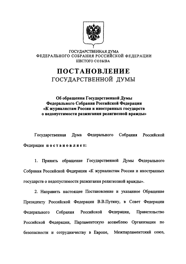 "ОБ ОБРАЩЕНИИ ГОСУДАРСТВЕННОЙ ДУМЫ ФЕДЕРАЛЬНОГО СОБРАНИЯ РОССИЙСКОЙ ФЕДЕРАЦИИ "К ЖУРНАЛИСТАМ РОССИИ И ИНОСТРАННЫХ ГОСУДАРСТВ О НЕДОПУСТИМОСТИ РАЗЖИГАНИЯ РЕЛИГИОЗНОЙ ВРАЖДЫ"