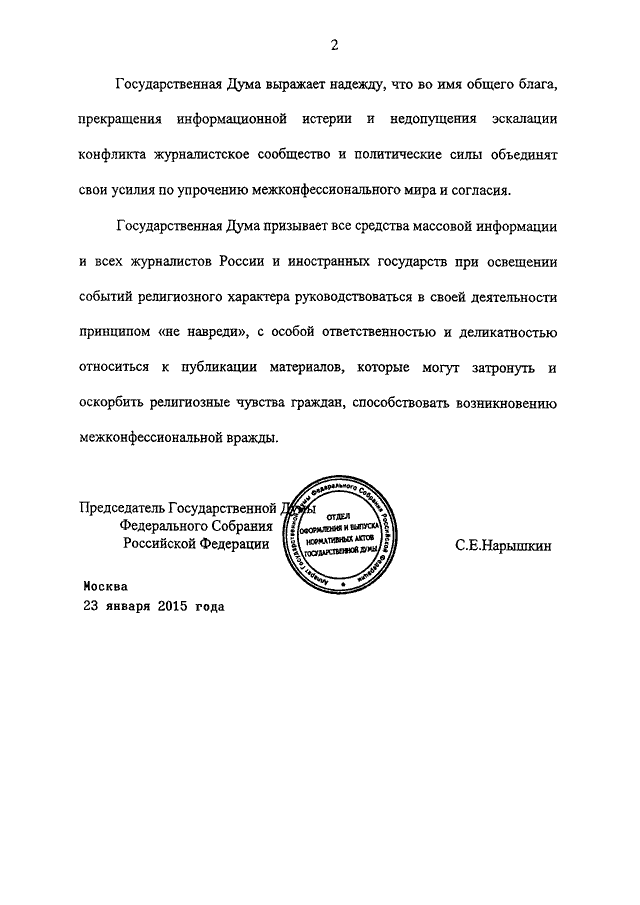 "ОБ ОБРАЩЕНИИ ГОСУДАРСТВЕННОЙ ДУМЫ ФЕДЕРАЛЬНОГО СОБРАНИЯ РОССИЙСКОЙ ФЕДЕРАЦИИ "К ЖУРНАЛИСТАМ РОССИИ И ИНОСТРАННЫХ ГОСУДАРСТВ О НЕДОПУСТИМОСТИ РАЗЖИГАНИЯ РЕЛИГИОЗНОЙ ВРАЖДЫ"