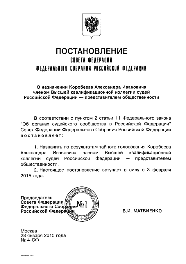 "О НАЗНАЧЕНИИ КОРОБЕЕВА АЛЕКСАНДРА ИВАНОВИЧА ЧЛЕНОМ ВЫСШЕЙ КВАЛИФИКАЦИОННОЙ КОЛЛЕГИИ СУДЕЙ РОССИЙСКОЙ ФЕДЕРАЦИИ - ПРЕДСТАВИТЕЛЕМ ОБЩЕСТВЕННОСТИ"
