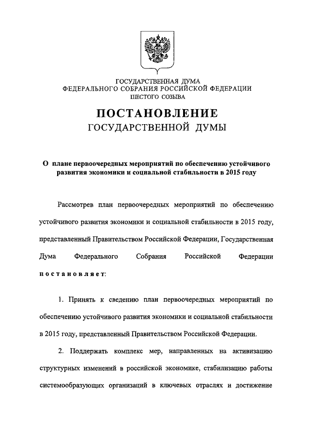 "О ПЛАНЕ ПЕРВООЧЕРЕДНЫХ МЕРОПРИЯТИЙ ПО ОБЕСПЕЧЕНИЮ УСТОЙЧИВОГО РАЗВИТИЯ ЭКОНОМИКИ И СОЦИАЛЬНОЙ СТАБИЛЬНОСТИ В 2015 ГОДУ"