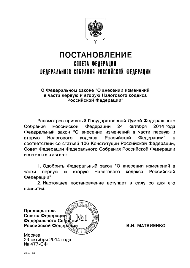ПОСТАНОВЛЕНИЕ СФ ФС РФ от 29.10.2014 N 477-СФ