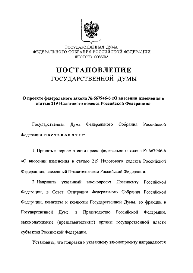 "О ПРОЕКТЕ ФЕДЕРАЛЬНОГО ЗАКОНА N 667946-6 "О ВНЕСЕНИИ ИЗМЕНЕНИЯ В СТАТЬЮ 219 НАЛОГОВОГО КОДЕКСА РОССИЙСКОЙ ФЕДЕРАЦИИ"