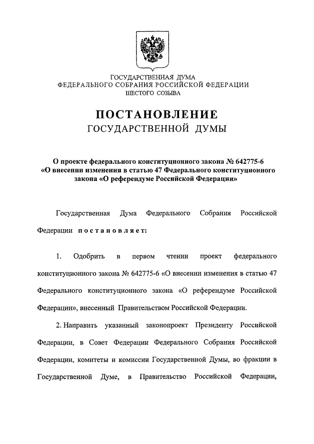 "О ПРОЕКТЕ ФЕДЕРАЛЬНОГО КОНСТИТУЦИОННОГО ЗАКОНА N 642775-6 "О ВНЕСЕНИИ ИЗМЕНЕНИЯ В СТАТЬЮ 47 ФЕДЕРАЛЬНОГО КОНСТИТУЦИОННОГО ЗАКОНА "О РЕФЕРЕНДУМЕ РОССИЙСКОЙ ФЕДЕРАЦИИ"