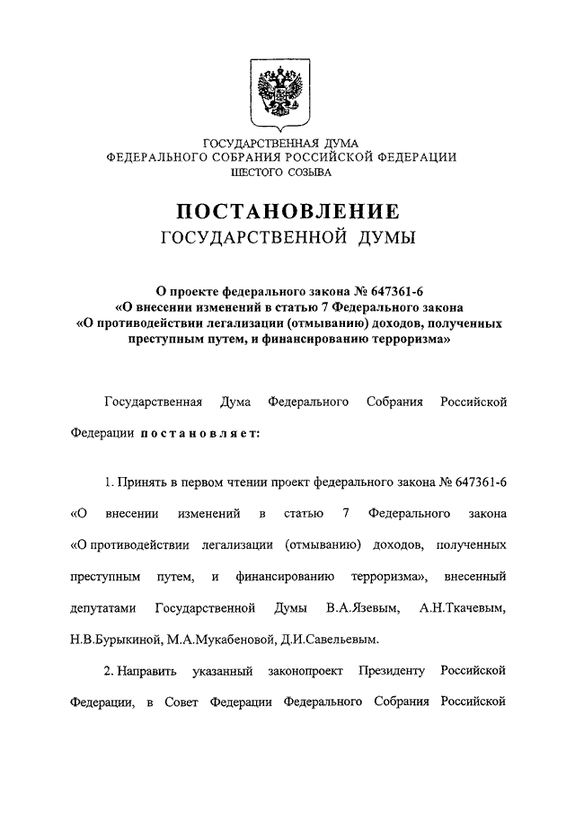 "О ПРОЕКТЕ ФЕДЕРАЛЬНОГО ЗАКОНА N 647361-6 "О ВНЕСЕНИИ ИЗМЕНЕНИЙ В