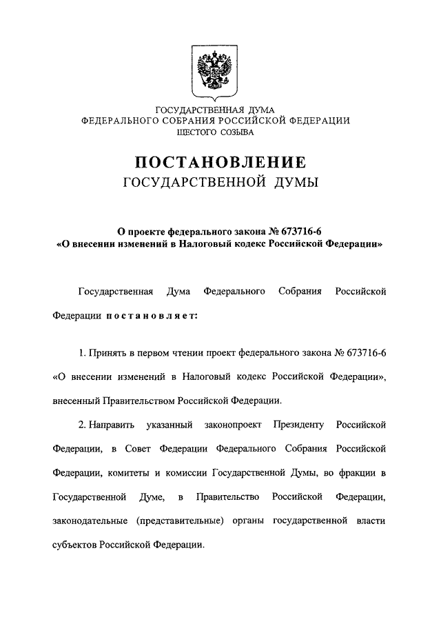 "О ПРОЕКТЕ ФЕДЕРАЛЬНОГО ЗАКОНА N 673716-6 "О ВНЕСЕНИИ ИЗМЕНЕНИЙ В НАЛОГОВЫЙ КОДЕКС РОССИЙСКОЙ ФЕДЕРАЦИИ"