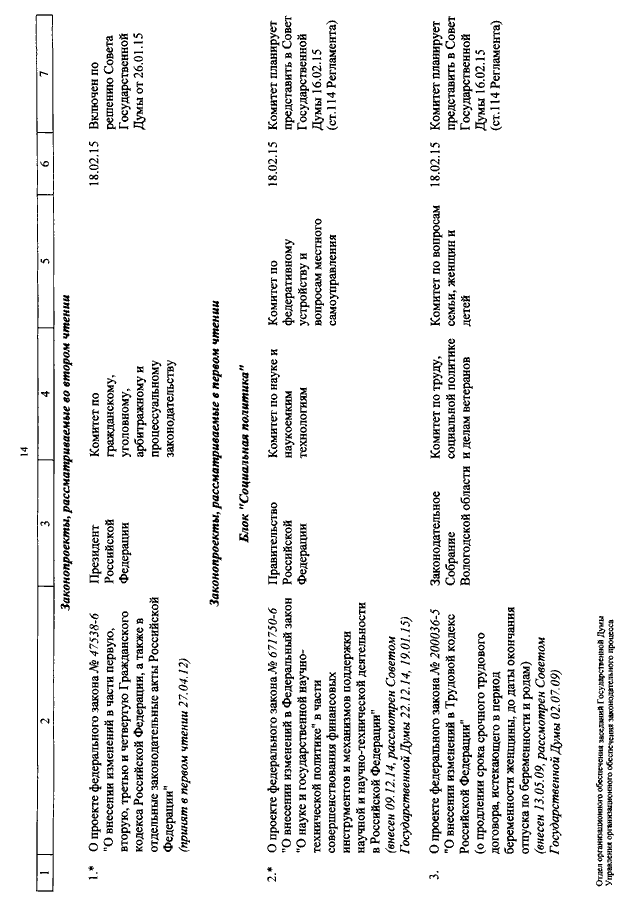 "О КАЛЕНДАРЕ РАССМОТРЕНИЯ ВОПРОСОВ ГОСУДАРСТВЕННОЙ ДУМОЙ С 17 ПО 27 ФЕВРАЛЯ 2015 ГОДА"